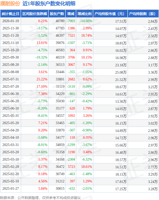 500)this.width=500 align=center hspace=10 vspace=10 rel=nofollow/500)this.width=500 align=center hspace=10 vspace=10 rel=nofollow/>证券之星动静,按照统计,截至2026年1月10日公司股东户数为4.08万户,减幅为14.66%。正在此期间股东户数削减7003.0户,不形成投资。户均持股数量由上期的2.43万股添加至2.84万股。